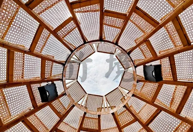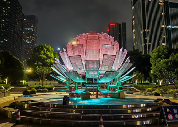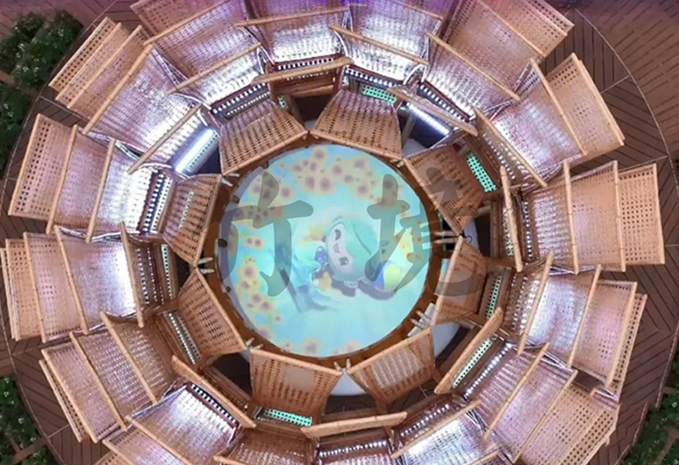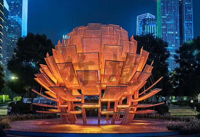 松果造型艺术装置结合雾森、灯光与传动控制系统,每一片都能够实现开合,营造自然界中松果受湿度影响而逐渐变化的浪漫过程。松果造型装置白天无灯光效果,灯光在夜间展演时间内为常亮状态,并伴随松果鳞片动态变化呈现呼吸效果,亮度最小值至最大值暂定360-806流明。