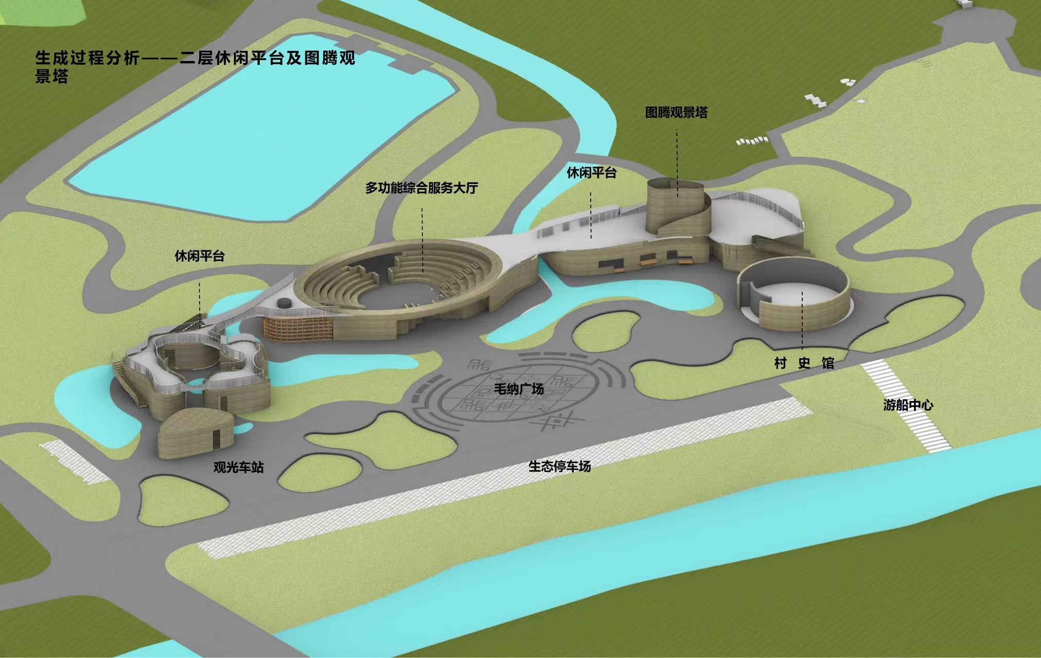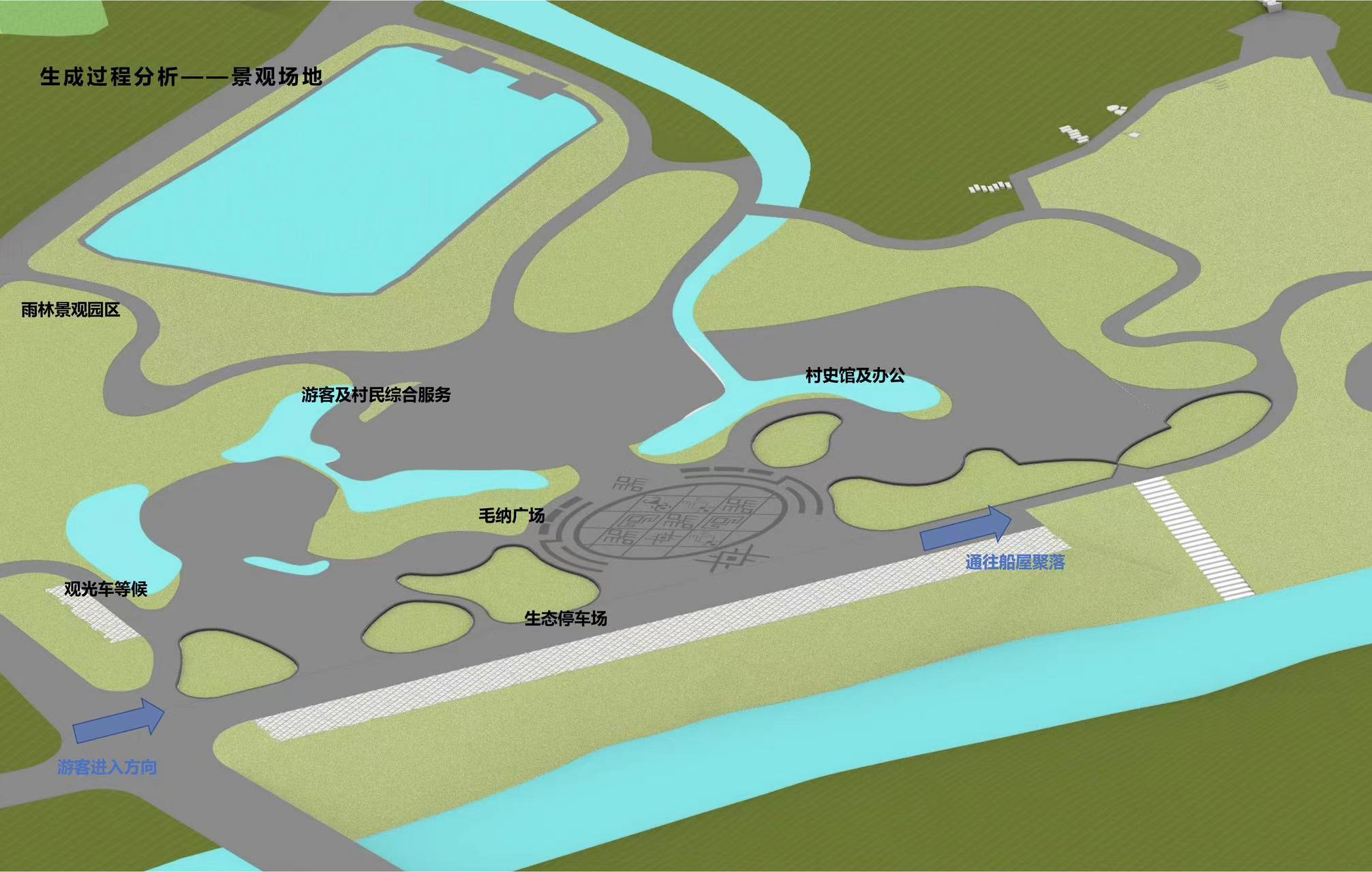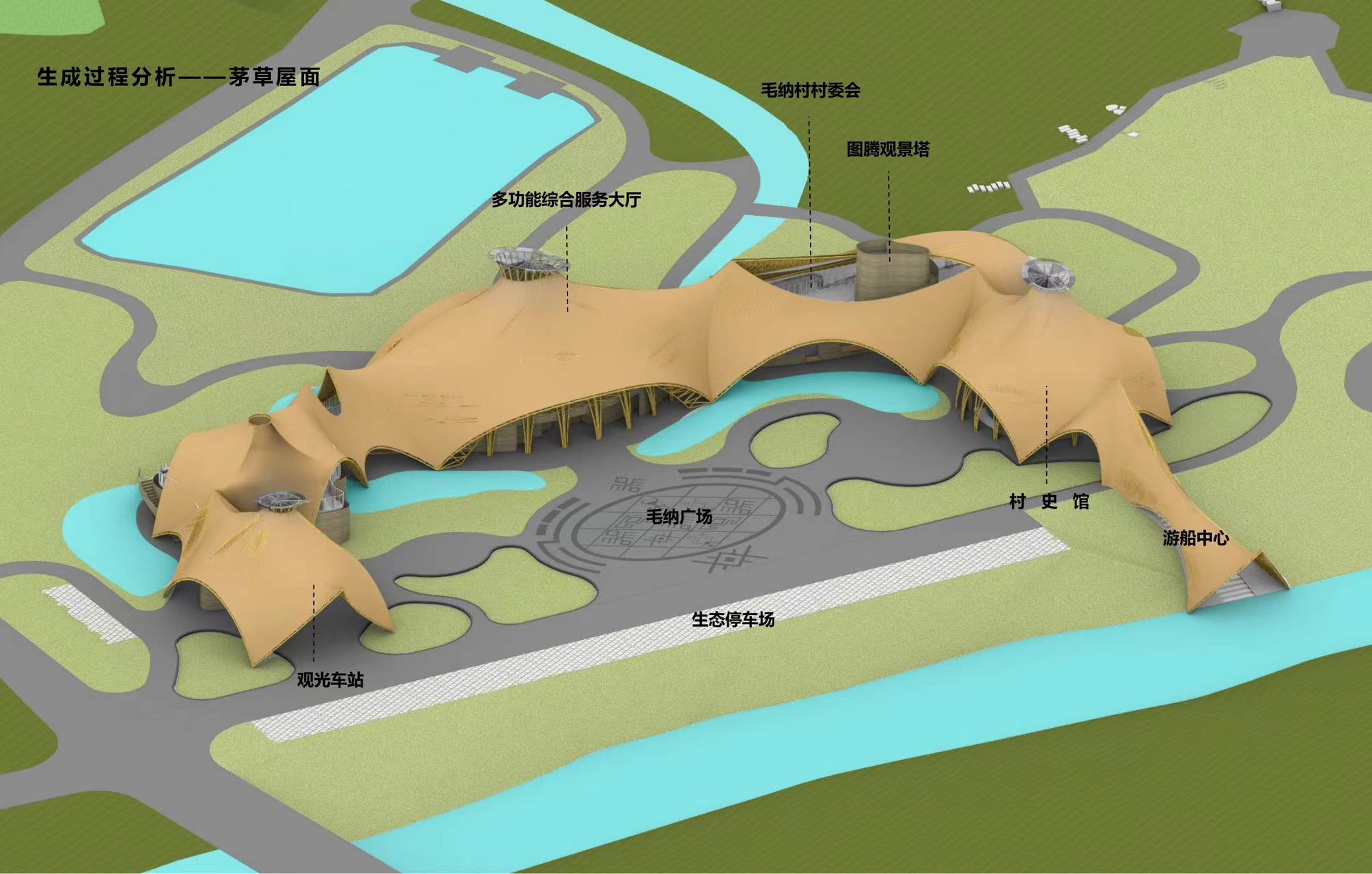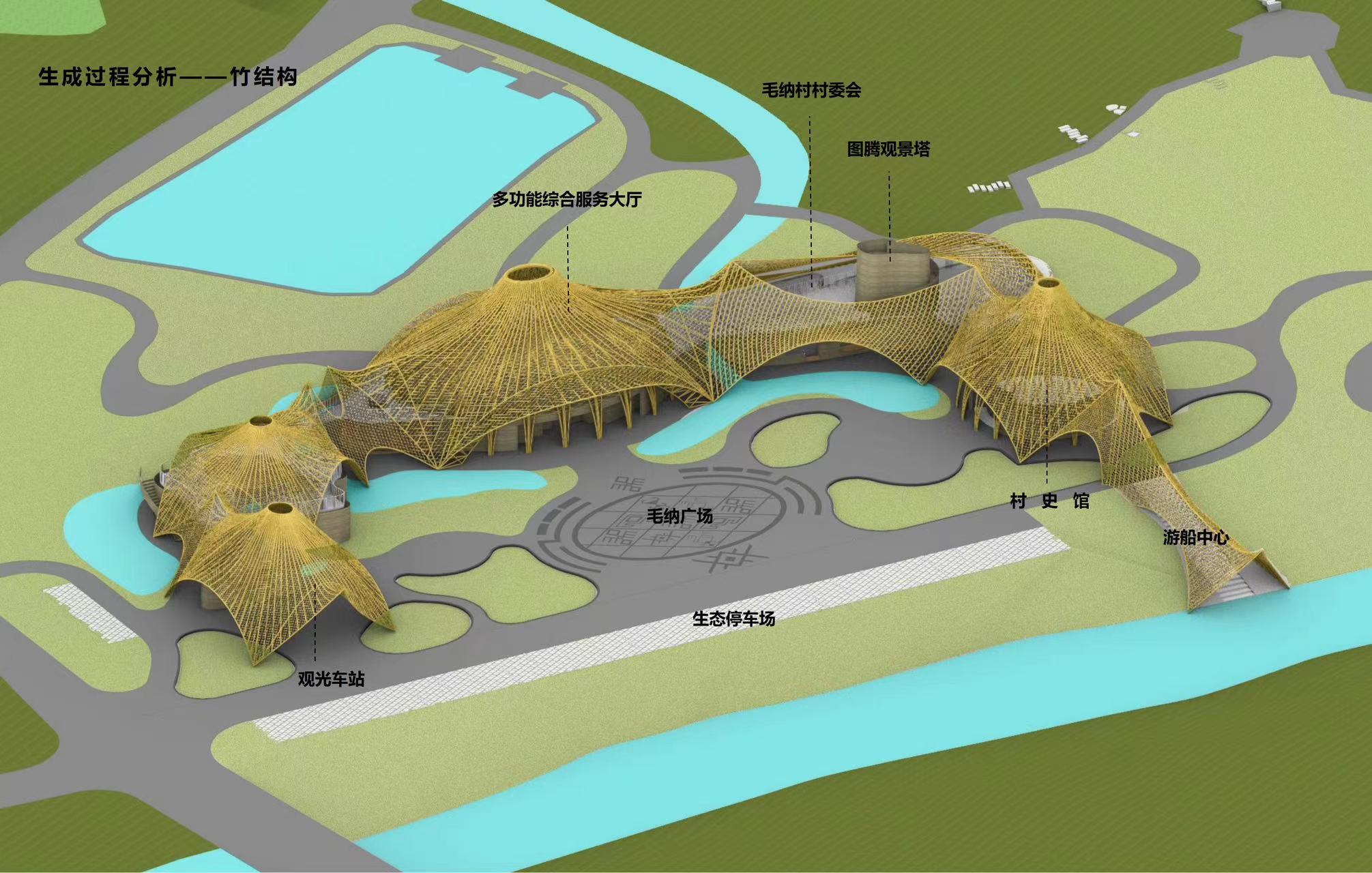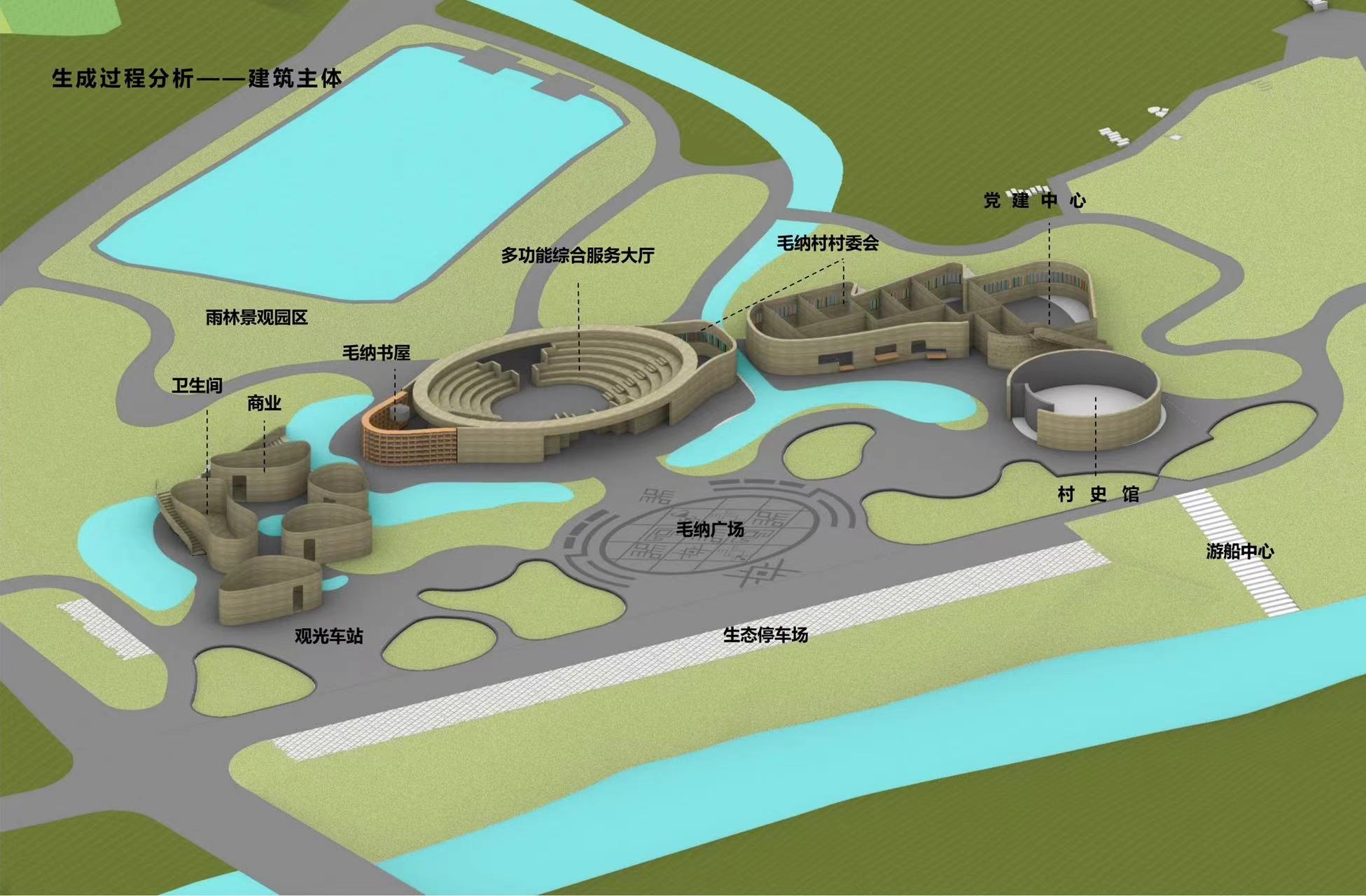 整体建筑是按照一心、两轴、三区,多点的景观系统结构打造。涵盖了5大功能服务区,其中包括综合服务区、雨林漫步区、(黎寨)船屋民俗体验区、还有一个活动演艺区跟组团集散区等,一共5大部分,包括主席沿线之路的空间改造提升,外立面改造,还有河道治理,茶山改造等等,大大推进了文明生态建设,改善了当地的居民风貌,对毛纳村经济发展起到一定的推动作用。