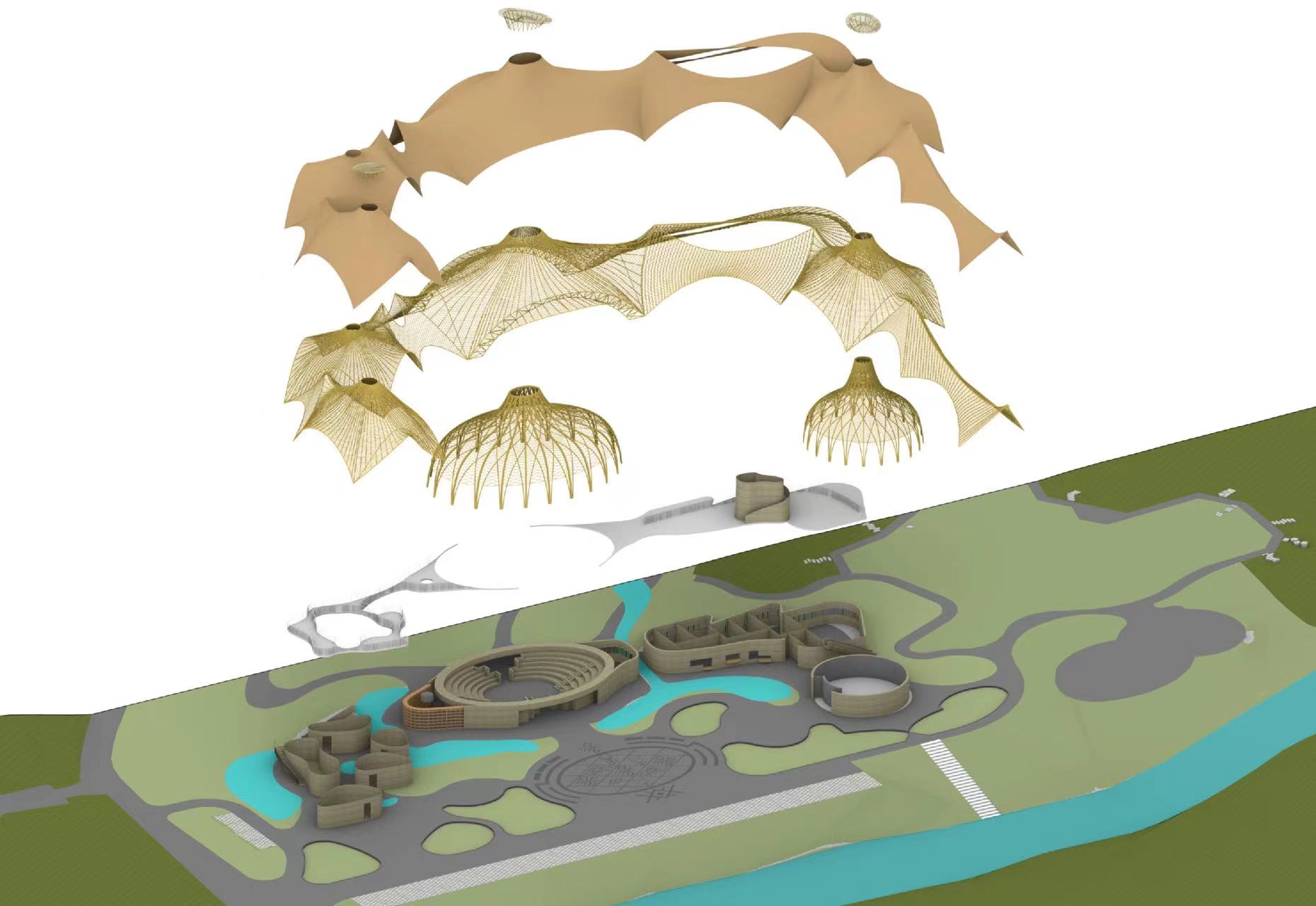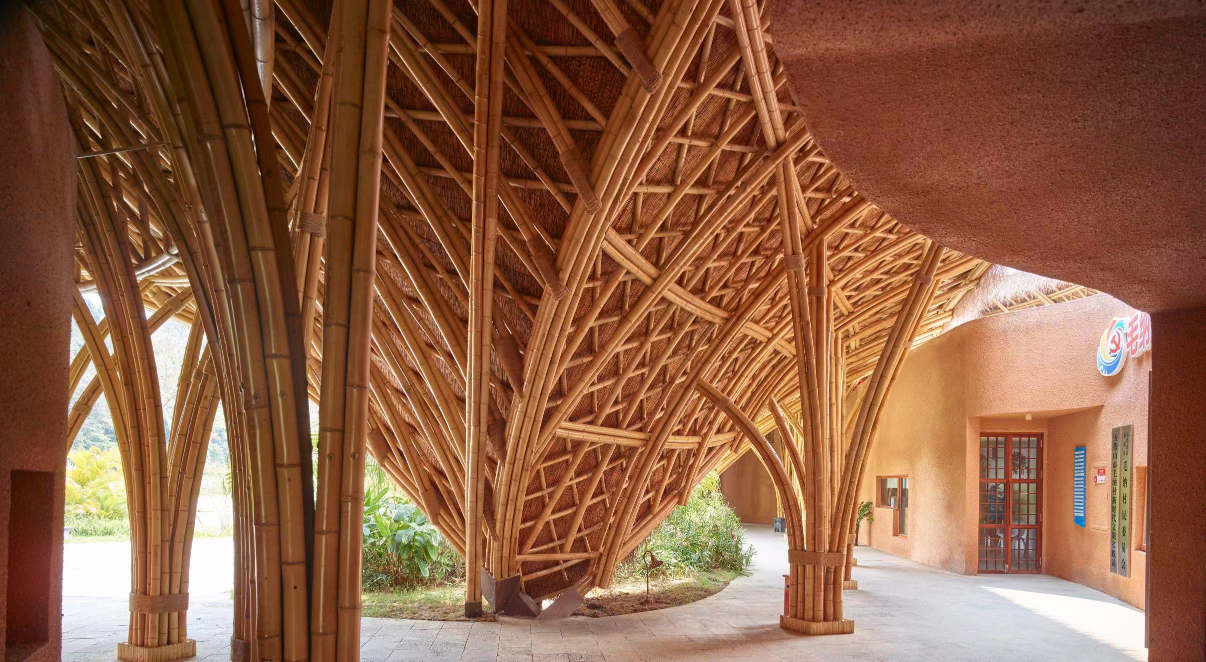 建筑主体使用本地的红土作为墙面材料,这不仅体现了对自然资源的利用,同时也促进了生态平衡。二层为休闲平台,自然光线渗透,增强室内外的视觉连通性。第三层由原竹搭建而成,竹子是一种快速生长、可再生的资源,其强度和耐用性使其成为理想的建筑材料。竹结构还具有良好的抗震性能。最后一层树梢构成屋面不仅美观,而且具有出色的防水和遮阳性能。它能够自然调节室内温度,减少对空调设备的依赖,从而降低能源消耗。