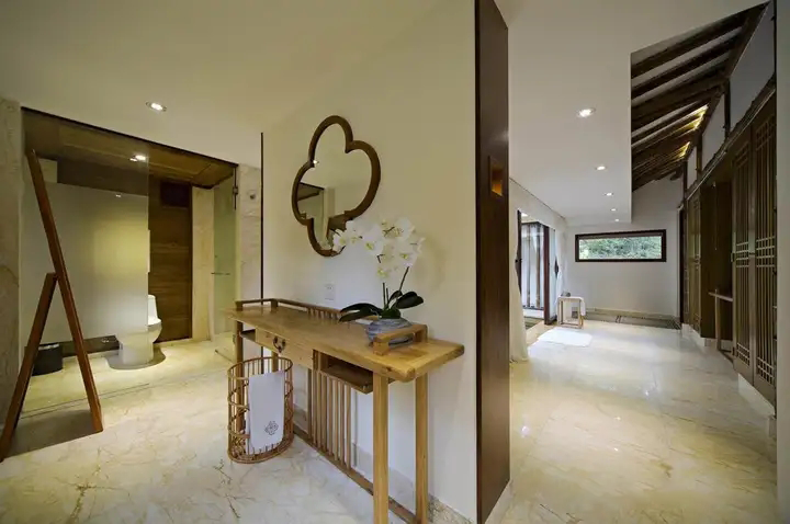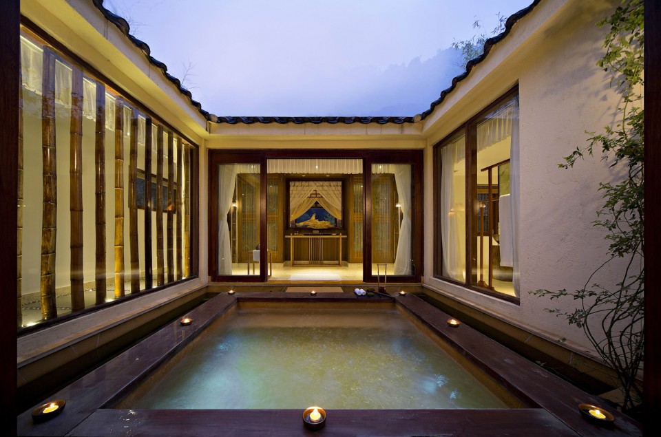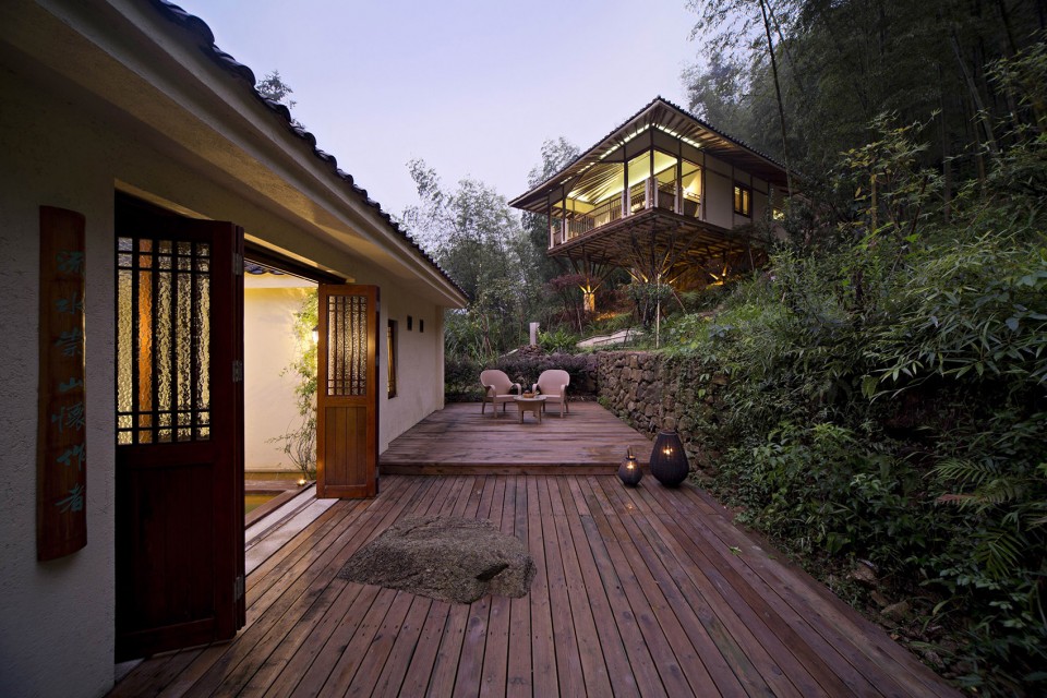 竹别墅室内外从客家民居建筑中吸取灵感,采用前半部吊脚楼与后半部天井院落相结合的空间布局,干湿分区,前半部为32根木桩托起的吊脚楼,包括客房和观景阳台;后半部为天井式温泉区,包括湿区、温泉池和户外平台。由于温泉区的改造,使得建筑的功能性和艺术性得到扩展。