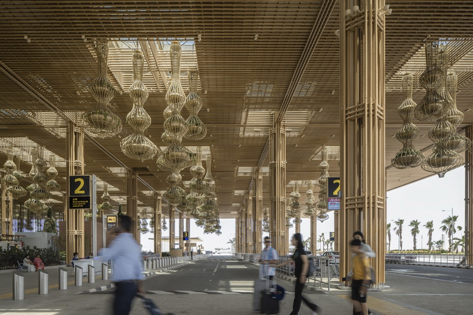 2号航站楼的内部空间回应了森林带郁郁葱葱的自然审美。各种悬挂植物和天窗通过精致的竹网格过滤,使这些空间变得丰富而感性。建筑结构采用正交形式,有别于常见的弧形机场屋顶结构,长长的屋檐遮住了路边,静静地伸入室内。建筑的每根立柱都由四根竹子包裹的钢构件组成,这些构件将格子的纹理一直延伸到地面,增强了航站楼内的光线和空间感。定制的家具采用传统的藤条编织和当地采购的象牙棕色花岗岩,为航站楼增添了一种温暖和舒适的感觉,而这种感觉在大型公共基础设施工程中往往是缺乏的。在综合体的零售部分,受卡纳塔克邦的巨石和河道启发而设计的室内瀑布成为标志性的焦点,同时还能降低室内温度。