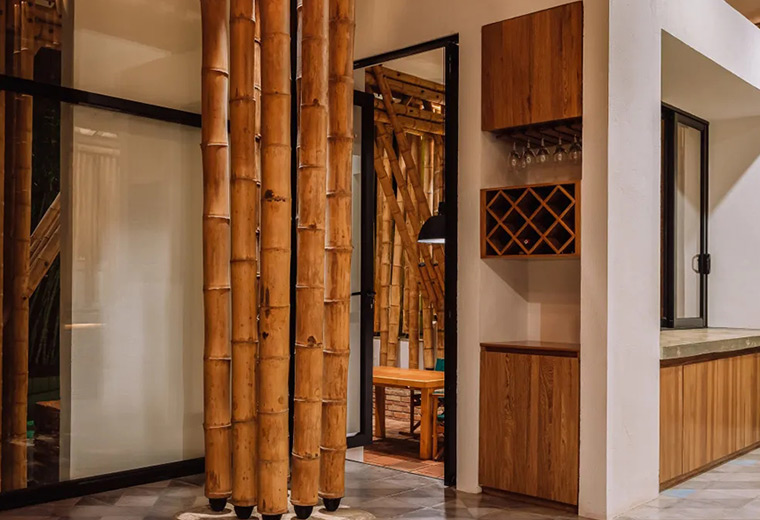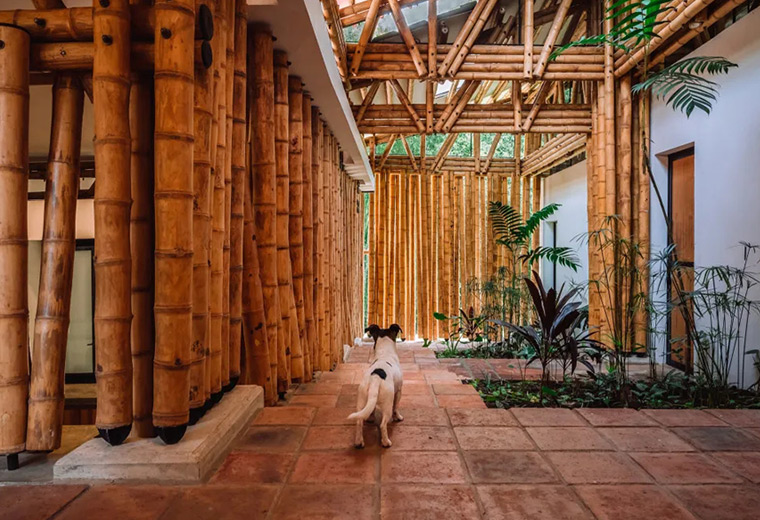 在同一层面上,厨房位于房子的中心,没有墙壁使它与周围的房间有一个外围关系。餐厅有屋顶但又是开放式的,作为房屋覆层内部和外部的中间地带发挥作用。在这里,部分被Guaduaportico遮挡,当地的野生动物经常光顾露台。