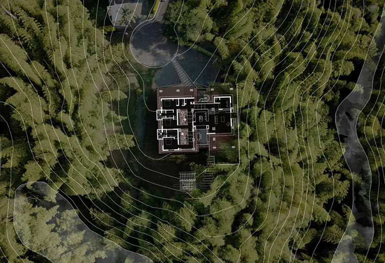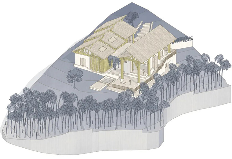 该项目融合了匈牙利建筑师马塞尔-布鲁尔制定的为不同活动分配区域的原则。因此,房子被分为两个核心:一个休闲区和一个聚会区。在其正式的结构中,休闲区由一个被隔成三个单元的屋檐围住。相比之下,聚会区被一个连续的屋檐和一个受现代主义运动启发的可居住的屋顶所遮挡。