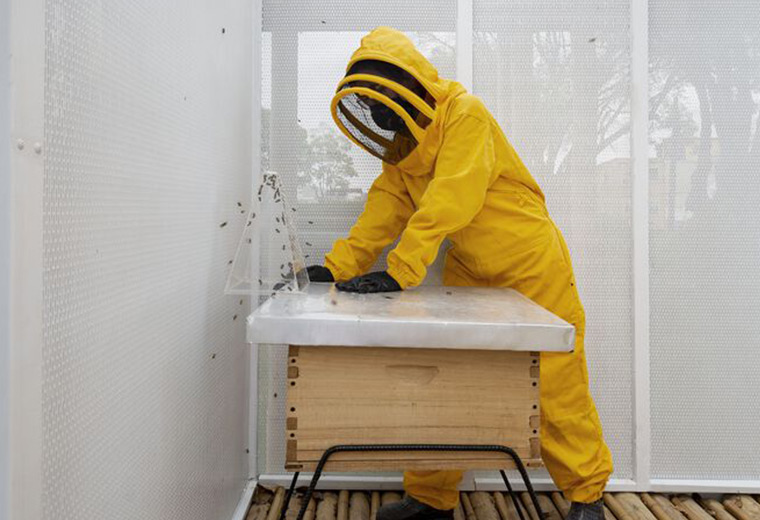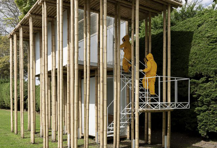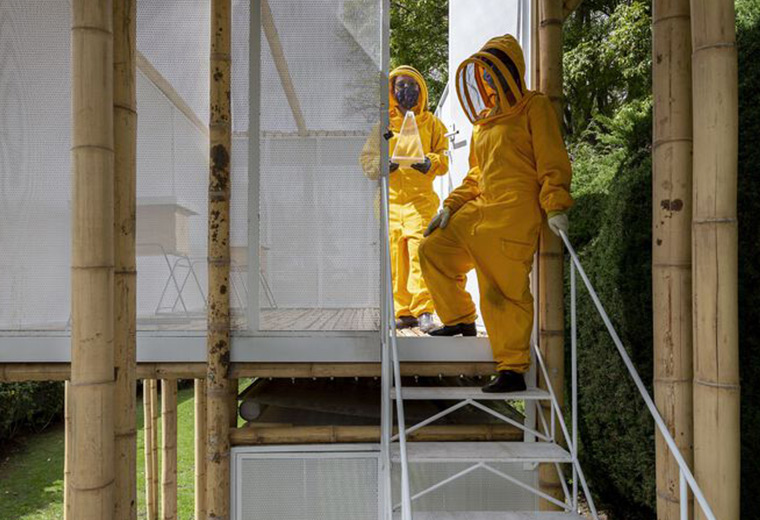 这个为数千只蜜蜂打造的小型竹构建筑,被选入第十二届伊比利亚美洲建筑与城市设计双年展(XII BIAU)和哥伦比亚双年展,使蜜蜂和工作人员能够在同一个地方共存。奇妙的是:蜜蜂在里面,但是拥有一个向天空开放的空间;人在外面,被保护在一个隐隐约约的竹丛中。