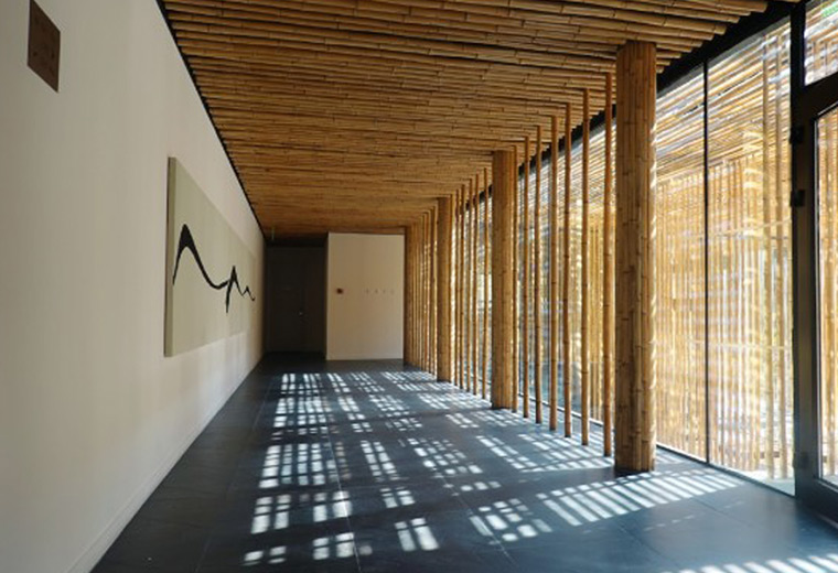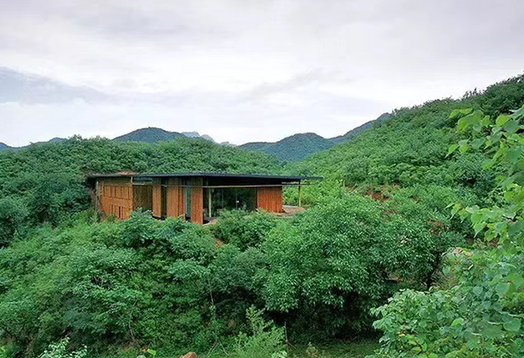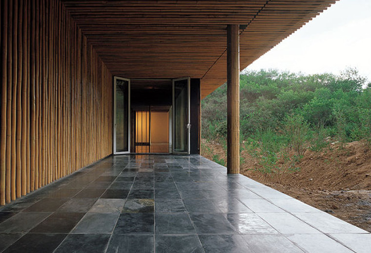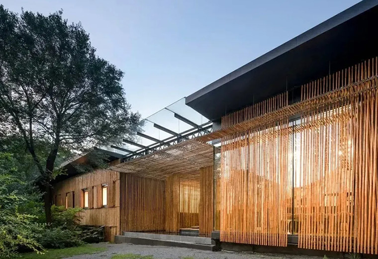 他还力图使建筑的精度符合建筑场地所固有的“风景的精度”,将建筑“粗矿化”,使建筑与长城以及周边风景的那种粗矿(低精度) 达到和谐的统一。整个房子的形态及材料的选择都表现出基地所承载的内在信息,在郁郁葱葱的树木掩映之下,竹格栅有秩序的排列,似隐似现,宁静、淡泊,自然而不造作,象征性地表现了长城“墙”的特质,不但谦虚的融入了自然,还成为自然景观中的亮点,令自然充满灵气。
