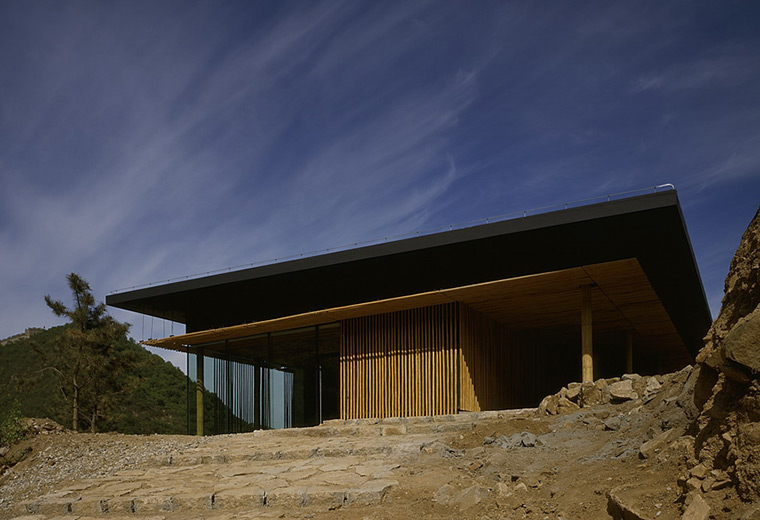 隈研吾认为“长城是在保留了复杂倾斜的基础上建造起来的延绵不断的连续体",其本身不是单纯的,个体的,而是融入自然环境中的,自然的一部分。于是他在未经修造的斜面上,充分地利用地形建造,“将细长的平面形小心翼翼地放了上去”,使得建筑以一种本质的状态存在于自然中。