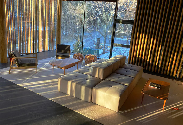 外立面竹屋由巨大落地玻璃和纤纤细竹构成,通过让竹墙密度与直径的不同,将不同空间分割,日出日落,日光从不同的角度照入室内,经过竹林与玻璃的几次反射,将日光表现为“万丈光芒”,好似佛光普照。春夏秋冬,太阳照入角度不同,加上雪景、冰景的变化,四季又形成不同的光影景观。