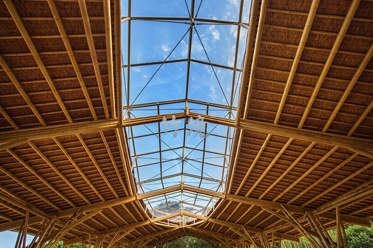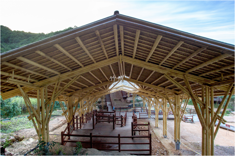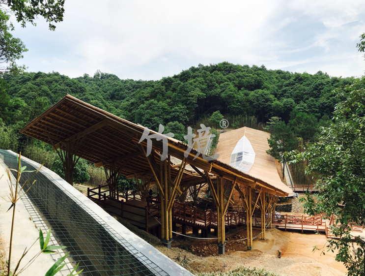 设计思路:就地取材,以原竹作为建筑主体材料,以杉木作为步行栈道材料。