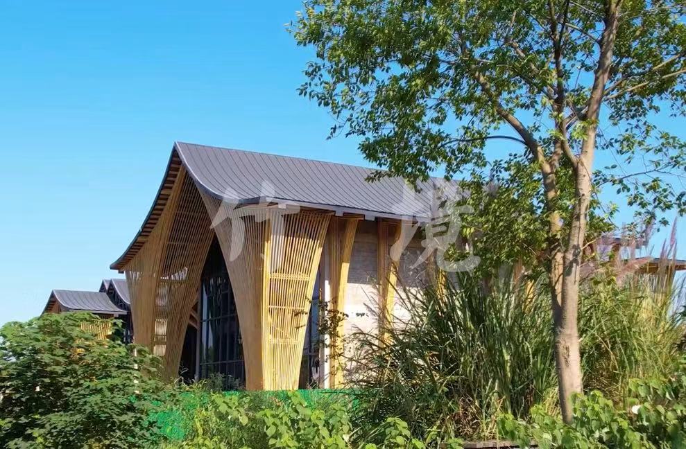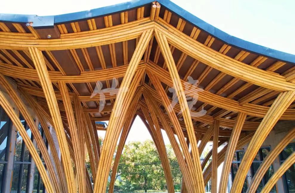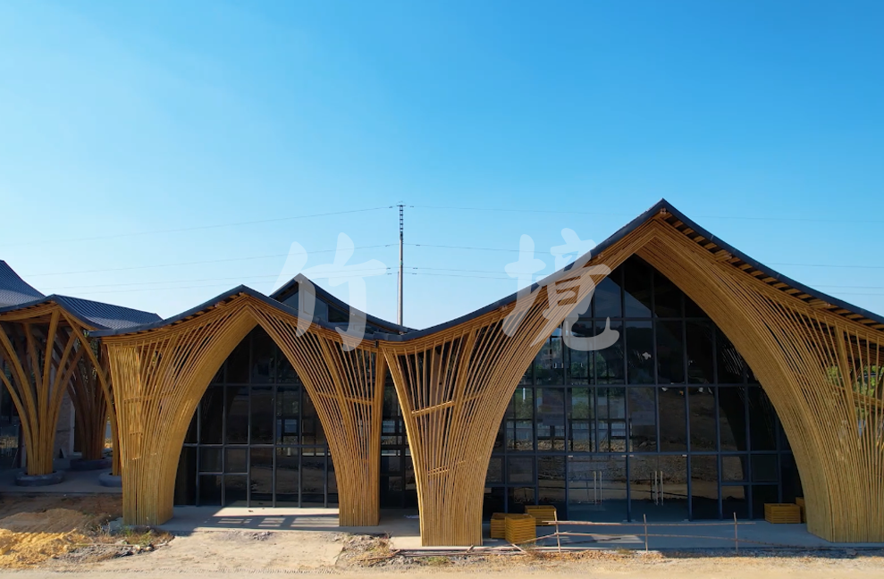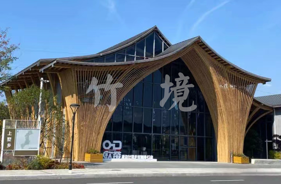 上墅乡农业展示厅作为一个竹结构展示厅,占地1300余平,具有独特新颖之美。整体空间及结构主要分为两部分,内部主体部分与外部门头部分,两者屋顶的衔接形成屋顶的错落层次感。根据设计需求及竹材受力分析,将建筑划分为大小不一的4个空间,3个内部展呈空间和1个外部休憩空间,而外部空间立柱形式作为连接纽带将左右展呈空间连为一体。
