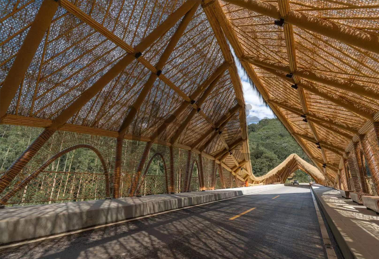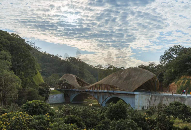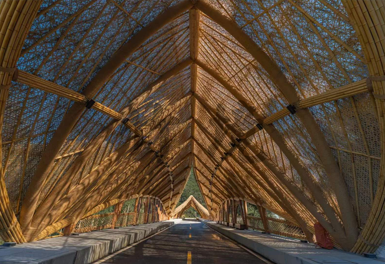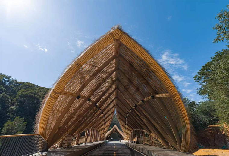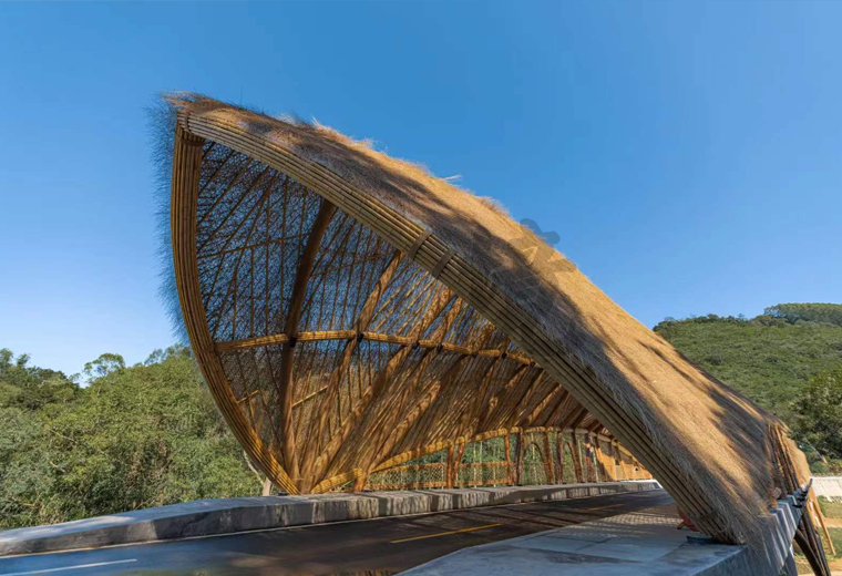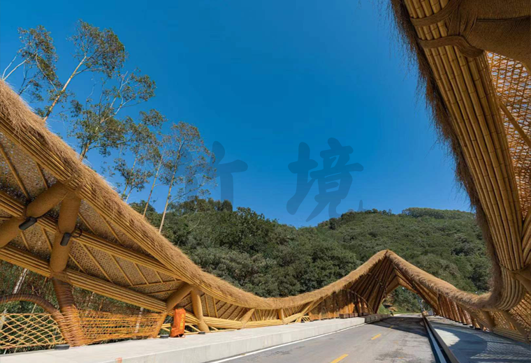 顶棚的竹稍有缝隙,顶棚与骨架之间设置了防水层,遮挡雨水。防水层以竹篾编织网承托。编织方式选择人工不规则乱编手法,以获取更好的艺术效果。阳光可以透过几层材料的缝隙散射到桥面。斑驳的光影洒落,游客穿行其中,自有独特的体验。